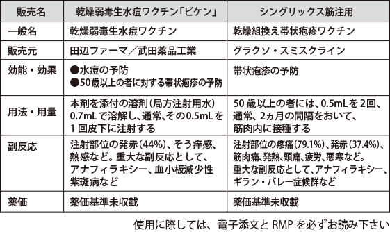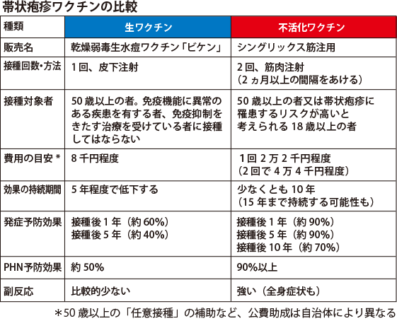 帯状疱疹ワクチンは、ウイルスを弱毒化した「生ワクチン」と、ウイルス表面蛋白の一部を抗原に、免疫反応を増強するアジュバント(免疫賦活剤)を添加した「不活化ワクチン」〔組換えサブユニット〕があります。生ワクチンは、安価で1回の皮下注射で済む反面、効果持続期間は短く、抗がん剤治療などで免疫機能が低下している人には使えません。不活化ワクチンは、高価で2回の筋肉注射が必要ですが、発症予防効果が高く、10年以上持続します。生ワクチンの副反応は比較的軽微で、局所症状が主です。不活化ワクチンは、注射部位の痛みや倦怠感、筋肉痛などの全身症状が強くでます(1日程度で軽快)。インフルエンザワクチンなど、不活化ワクチン同士は同時接種も可能ですが、注射生ワクチン同士は、27日以上の間隔を空ける必要があります。なお、生ワクチンは、シングリックスより効果が劣るとの理由で、海外では発売中止になりました。